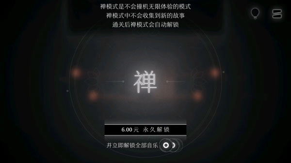 界面右上角有个莲花样式的按钮,对应的是禅模式。开启这个模式后,你可以无限制地体验,过程中不会出现撞机情况,也不会解锁新的故事内容。不过这个模式需要你先通过特定关卡才能解锁使用。