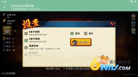7、在设置里找到“忍者配置”选项,通过它能够保证你100%招募到自己选定的忍者碎片。