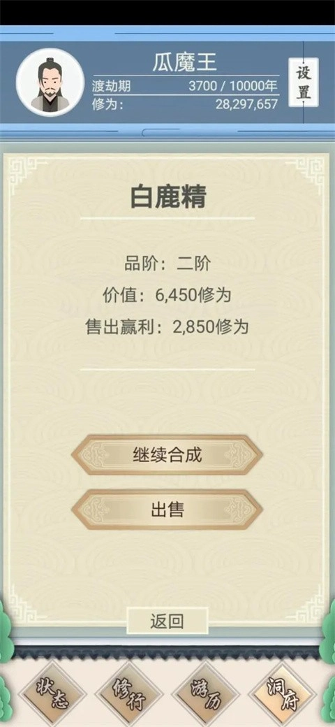 所以最划算的就是每次都选两个猫妖合成,合成白鹿精后就卖掉。等有仙树后,每轮的这几千修为的收益就比较小了,而且操作起来麻烦、费时间,我一般都直接放弃了。