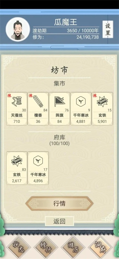 2、中前期阶段:恭喜你,这意味着你正式踏入了游戏的经商倒卖环节。此阶段的主要收益来源是通过坊市货物的低买高卖来获取,要是运气不错,就能狠赚一笔,那种感觉会非常畅快。看似不起眼的坊市,其实蕴含了不少炒股的思路,比如府库最多只能存放5种商品,而坊市每次刷新也最多出现5种商品。