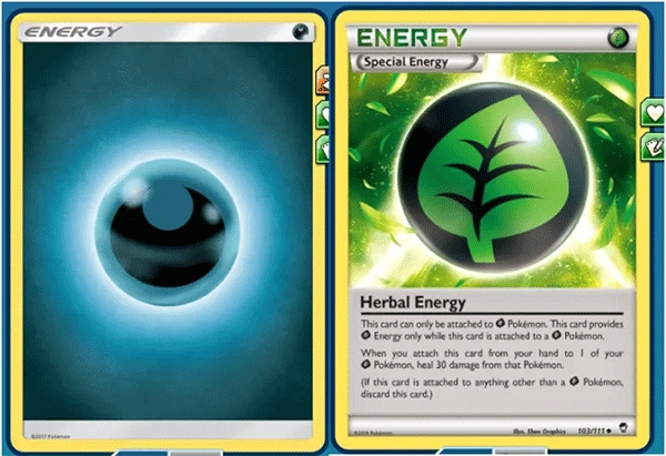 图中展示的是能量卡,普通精灵需要集齐一定数量的能量卡才能释放技能。此外还有特殊能量卡,这类卡片带有额外效果。像图里这张草系特殊能量卡,把它附着在精灵身上时,就能为该精灵恢复30点生命值。