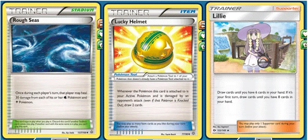 训练师卡是辅助场上精灵作战的卡牌,常见功能包括抓牌、减少对手手牌、为己方精灵施加增益效果或给对方精灵施加减益效果。这类卡牌分为场地卡、道具卡和支援卡三种类型。其中支援卡由于效果较强,每回合仅能使用一张,图片最右侧的卡牌即为支援卡,其效果是让使用者抓牌至手牌数量达到6张,若在第一回合使用,则可抓牌至8张。场地卡在场上最多只能同时存在一张,但可以通过打出新的场地卡来替换掉之前的场地效果。图片左侧的是场地卡,能为己方每只电系或水系精灵补充30点生命值。道具卡与支援卡有相似之处,不过每回合使用数量没有限制,图片中间的便是道具卡,效果是给己方精灵装备后,每次该精灵受到攻击时,使用者可以抽取两张牌。