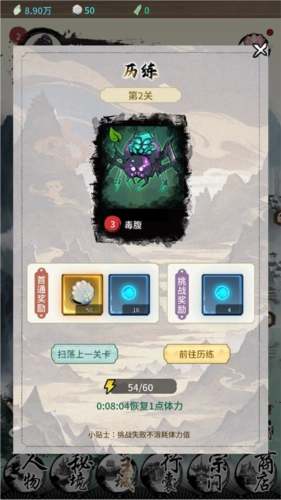 1、进入游戏后,玩家可以直接开始历练闯关,完成关卡,获取资源奖励,提升战力。