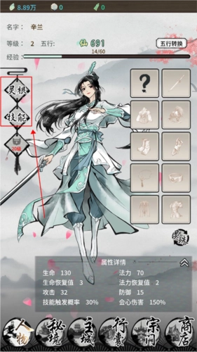 5、主角也有各种技能可以学习,还可以通过消耗特定材料来提升灵根等级,大幅提升战力。
