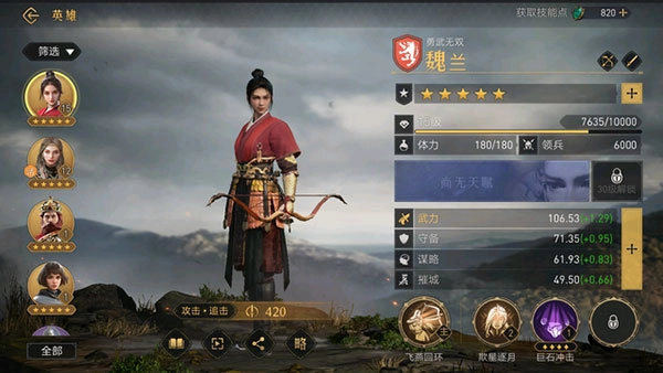 魏兰的技能全部受武力属性加成,所以加点选择武力的话,她能打出更高的伤害。