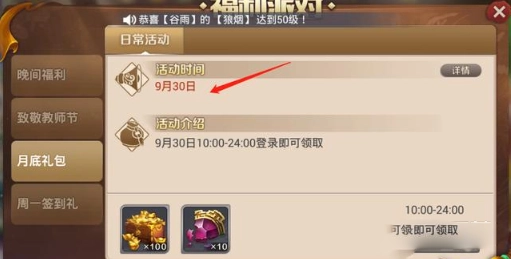 每个月月尾上线游戏能够获得100元宝