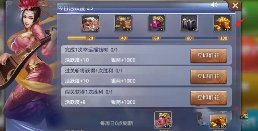 每天活跃度100点非常容易做完,而且周活跃度到达600可以获得100元宝,逐日活跃度到达100分别能获得金币,将军令,全能碎片,质料箱子,和10元宝。每个月四次周活跃度=400元宝