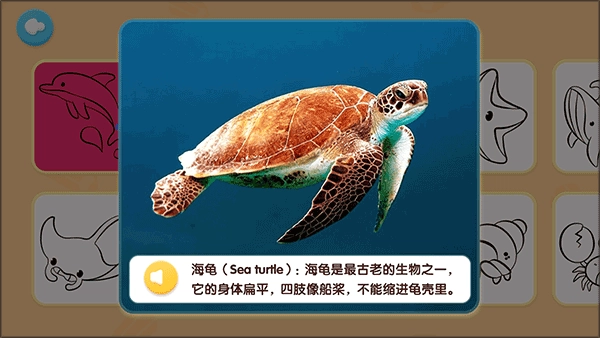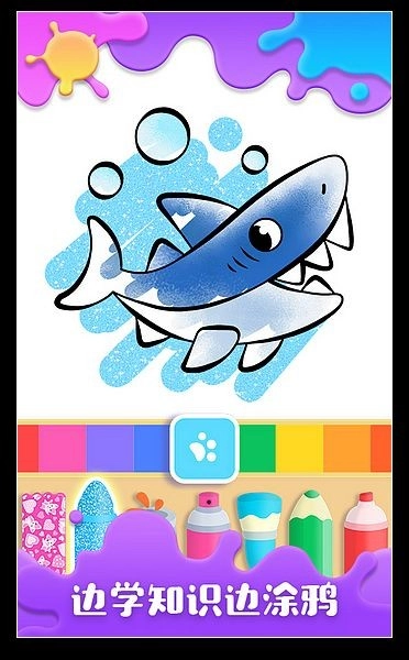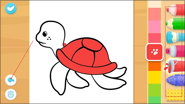 选择鲨鱼线稿,开启宝宝的艺术创作之旅吧!涂一涂、画一画,哎呀~要是宝宝发现画错了该怎么办呢?别担心,只要点点画板左边的箭头,就能回到上一步;如果想重新涂鸦,宝宝点一下删除按钮,刚才填涂的色彩就会消失,这样又可以重新开始涂色啦。
