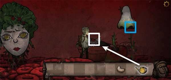 7、将玫瑰花给女人,进入嘴巴,白框处拿到一个机器,将蚕蛹放到机器里,使用机器获得绿色燃料,将燃料放入右边的灯具里,获得发光的灯