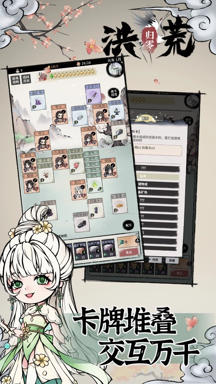 1.卡牌堆叠合成玩法,不断探索配方,合成洪荒世界万物;