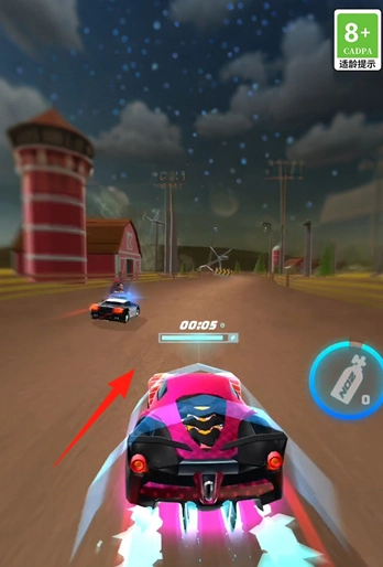 3、界面元素显示倒计时(00:05)、适龄提示(8+),有道具(氮气瓶),通过比赛积累成绩,解锁新赛车、赛道,提升竞速排名。