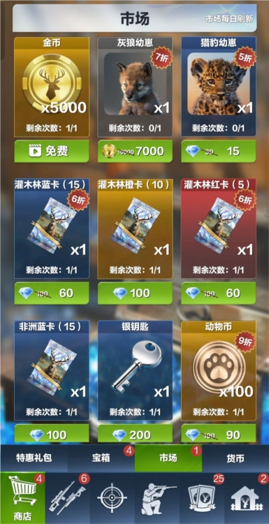 这里同样设有每日更新的市场,既提供免费金币补给,还能以优惠价格购买图鉴卡包与动物币!别忘了每天手动操作一下,可别错过福利啦!
