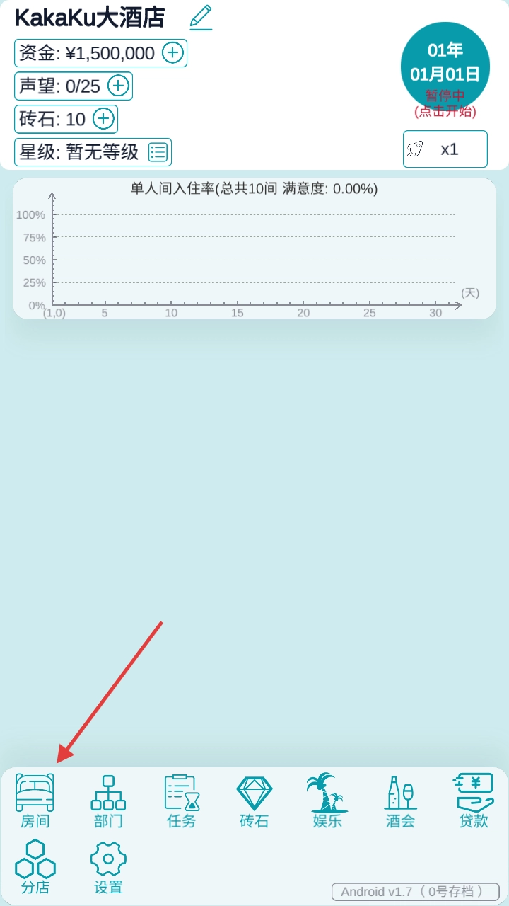 2、进游戏后,点左下角“房间”,管理客房,规划扩建~