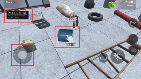 2、进入场景,用虚拟摇杆让角色行动,点击收集蓝色箱子等垃圾,将场地清理干净。