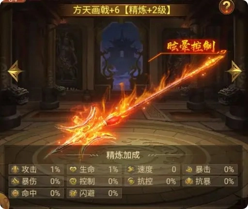 5.方天画戟:作为吕布独有的战戟,其戟尖线条灵动如绘,威名远扬四海。此戟在战斗中可同时对三名敌方将领发起攻击,并且有一定几率让受击目标陷入持续两回合的“昏迷”状态(该昏迷效果不受任何抗控属性影响)。每当方天画戟现世,敌人往往会在刹那间丧失抵抗的能力。