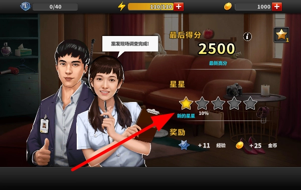 4、完成案发现场调查后,会显示最后得分、星星评价等,根据表现获得经验和金币奖励,提升游戏成果。