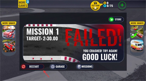 4、要是挑战没成功,随时都能点击RESTART重新开始,通过一次次练习来摸透最适合的过弯角度和刹车的最佳时机。