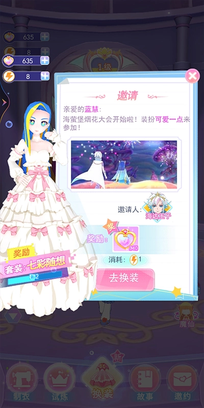 海达王子邀你共赏烟火大会,记得穿上华丽的礼服哟~ 除了衣橱里琳琅满目的百余套服装,你还能亲手设计制作——挑选不同款式的裙装,搭配缤纷绚丽的颜料、创意十足的贴纸,再配上精致多样的配饰,快来打造出专属于你的完美礼服吧!