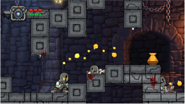 5、用小刀破坏下方的木箱后就能跳上去,接着往左上方向跳跃,拾取前方的金子