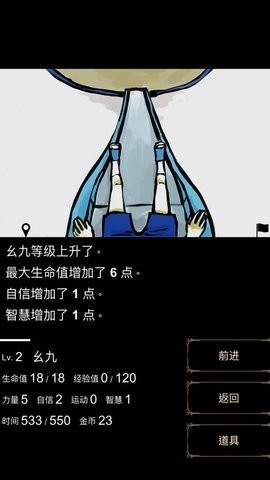 3、左下角显示着自身的等级、生命值、剩余时间、金币数量以及经验值等信息,过程中会触发诸多随机事件,你可以自行选择发起战斗或是选择逃离。