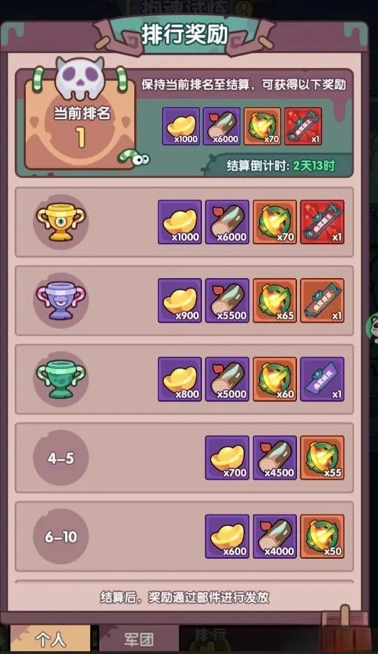 3、赛季军团排名奖励规则如下:以军团内所有成员的拘魂积分总和作为依据,在战区范围内对各军团进行排名;赛季结算时,系统会根据玩家当前所在军团的积分排名情况,通过邮件向该军团全体成员发放对应的军团排名奖励;若结算时玩家未加入任何军团,则不具备领取赛季军团排名奖励的资格。
