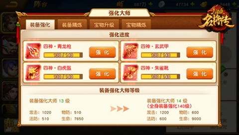 1、装备强化系统:利用丰厚的银两,强化装备等级,各个部件的强化效果不同,帮助你全面提升攻击、防御和生命,强化大师的特效更是让你的武将战力飙升!