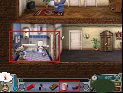 2、迅速前往左侧卫生间,在那里找到肥皂,把它放在地上。接着找厕纸,把它放进马桶。