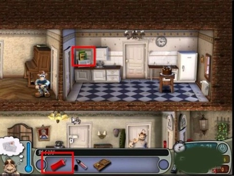 3、从客厅的门进入二楼厨房,留意观察,大老板已经下楼。赶紧去冰箱拿鸡蛋,藏在客厅门后等待机会。等老板下楼后,快速把鸡蛋放进微波炉里,再次躲好。
