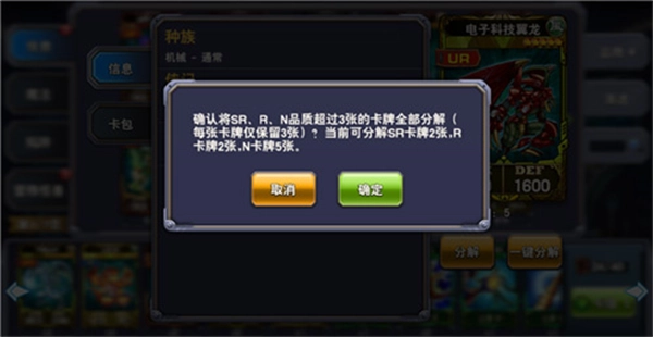 4、借助【一键分解】功能,玩家能够一次性分解掉当前卡组中SR、R、N品质且数量超过3张的卡牌,每种卡牌仅保留3张。