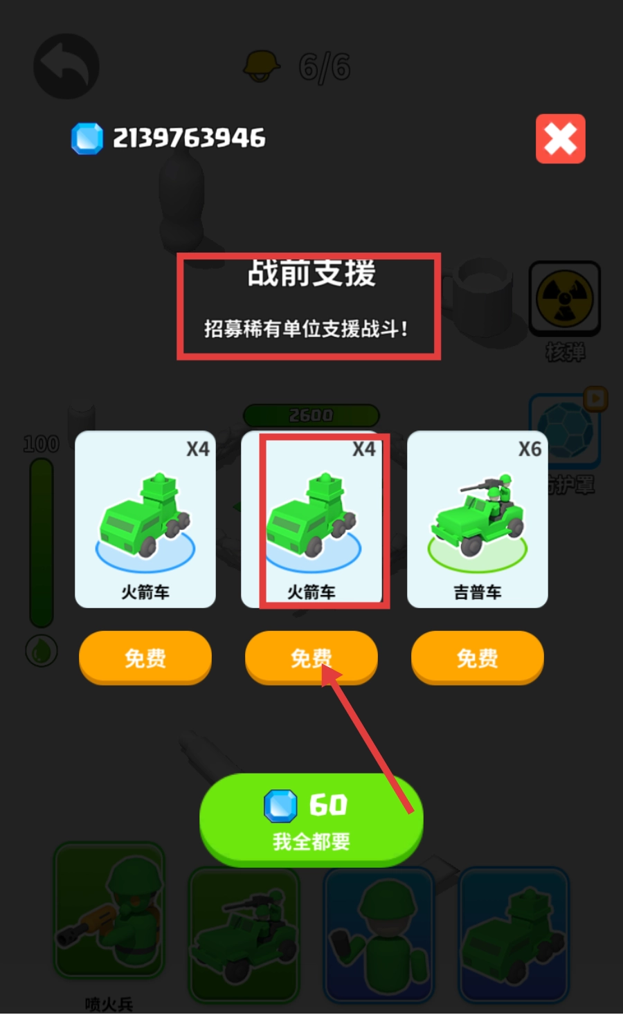 2、进入【战前支援】界面后,可免费招募【火箭车】这类稀有单位,为战斗补充强力战力,从而提高获胜的概率。