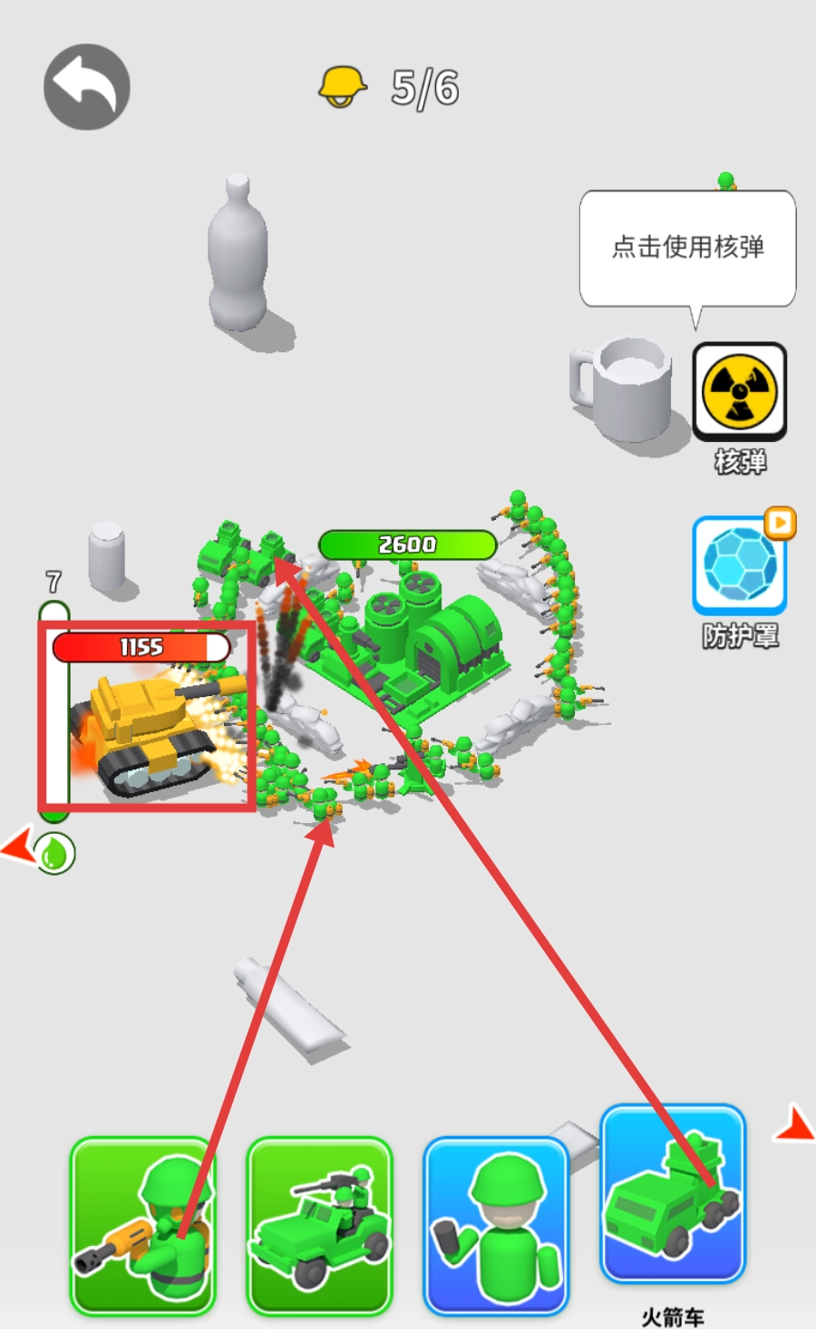 3、在战斗过程中遭遇敌方的【坦克-1155】时,要借助【火箭车】发起攻击,并且得留意【核弹】与【防护罩】的运用时机。
