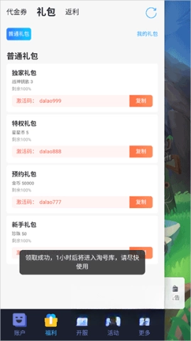 玩家登录游戏后,进入礼包界面就能领取兑换码,别忘了在有效期内使用,为你的冒险之旅增添助力!