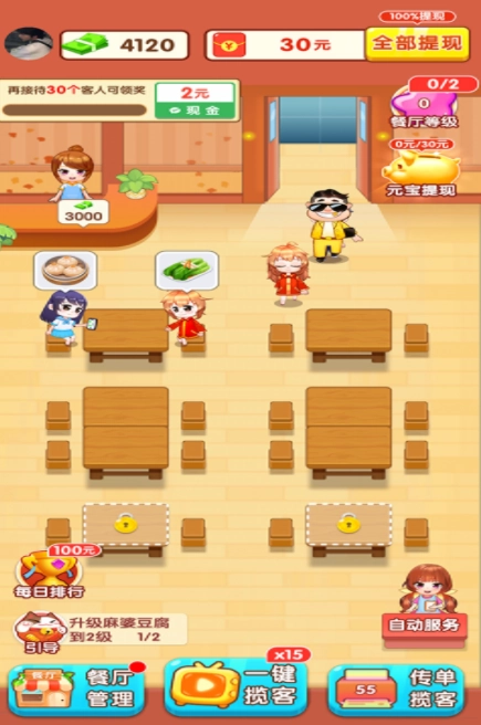 1、玩家得为自己的餐厅做宣传,以此吸引更多顾客前来光顾。当然,始终要秉持全心全意的服务理念,如此才能获得顾客的青睐,树立餐厅的良好口碑,金币也会随之越来越多。