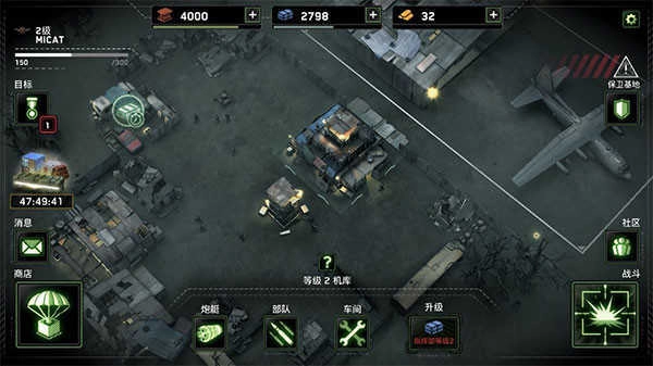 3、任务开始后,首先要设置『部队部署』的位置,红圈标注的是高塔区,该区域禁止部署部队。建议先观察『可掠夺资源』周边的建筑布局,计算每个障碍物与资源点之间的距离,同时明确任务目标的具体要求,尽量完成目标以获取更多资源。前期任务难度较低,比较容易完成,通过任务获得的宝箱可能开出5.56毫米机枪、MP5冲锋枪、火炮等装备,以及等级经验。点击『战队图标』可以查看所有武器和设施,其中红色标识的代表尚未获得的物品。