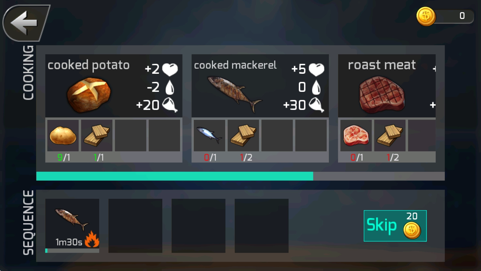 5、在操作菜单里选定“烤鱼”功能,放入新鲜的鱼类,启动烘烤程序制作高能量食物,以此恢复体力值。