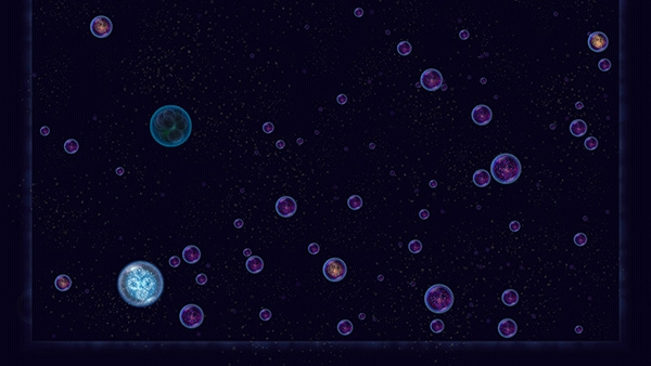 5、唯一的变量是玩家操控星球所喷出的气泡,气泡兼具两项功能:一是推动星球移动,二是能够推开周边的其他星球。借助气泡的这些功能,当玩家操控的星球接近其他星球时,便可利用惯性与气泡的推力来推开靠近自己的红色星球。