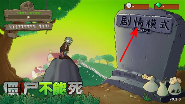 1、在游戏初始界面,点击剧情模式选项进入关卡流程,这是开启游戏的基础步骤,后续将在关卡中展开僵尸的生存挑战。