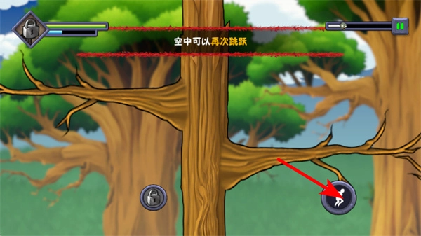 3、遇到如沟壑时,点击场景中的跳跃按钮让角色跨越障碍,同时留意界面提示操作规则如空中可再次跳跃,应对复杂地形。