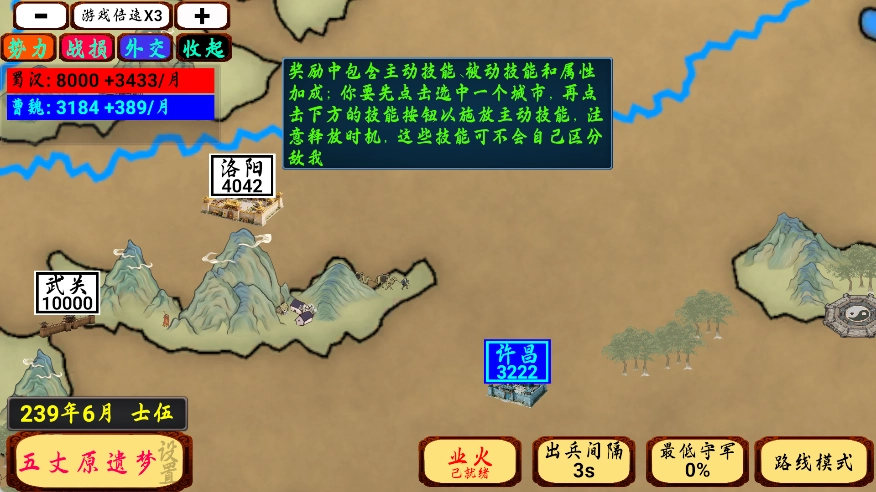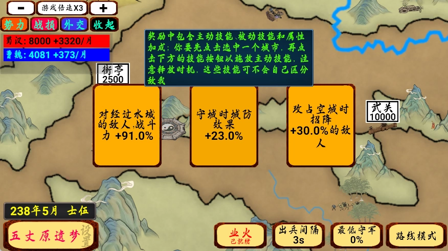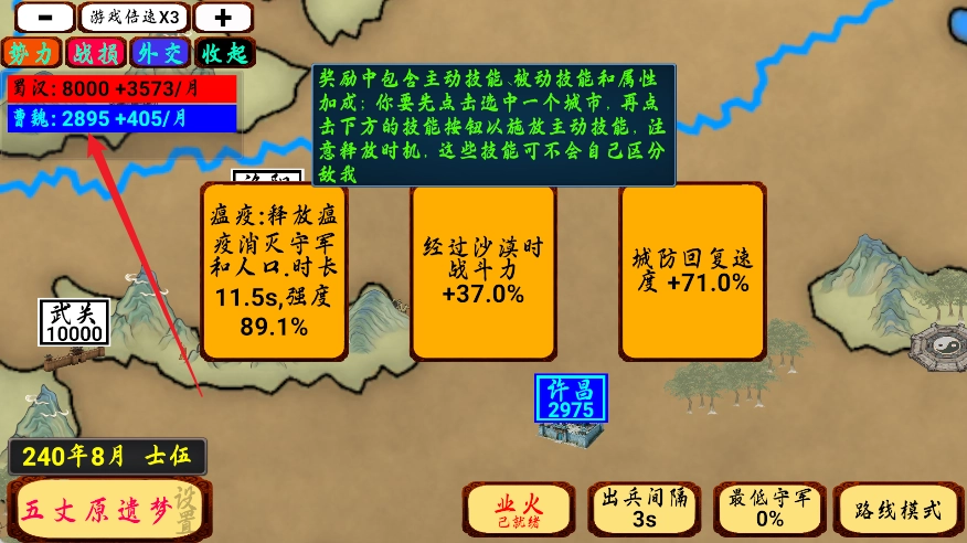 4、奖励涵盖主动技能、被动技能与属性加成。使用主动技能时,需先点击选中一个城市,再点击下方的技能按钮进行施放。请留意释放时机,这些技能无法自动辨别敌我。