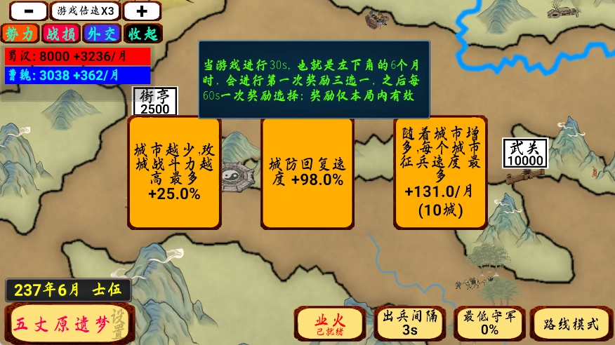 3、游戏进行到30秒时,也就是左下角显示6个月的时候,会开启第一次奖励三选一环节,之后每隔60秒会有一次奖励选择机会,这些奖励仅在本局游戏内生效