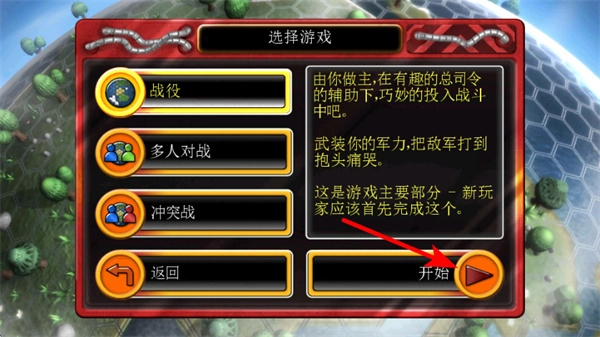 1、在游戏的选择界面中,挑选好战役等对应的玩法模式后点击开始按钮,就能进入策略对战关卡,这是开启战棋玩法的基础步骤。