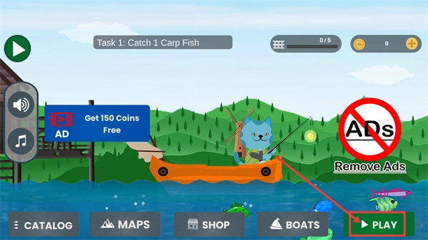 1、承接【Task-1:-Catch-1-Carp-Fish】任务后,点击【PLAY】按钮进入钓鱼界面,能够通过观看广告来获取【150-Coins】。