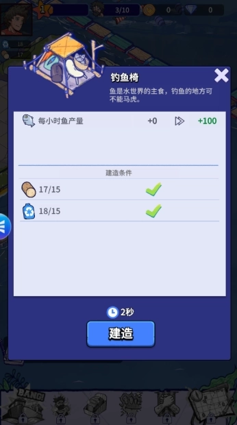 二、钓鱼椅、潜水船坞和拾荒船是前期获取资源的重要渠道,不过材料方面无需担心,系统会赠送大量材料。并且在20多级时,你可以大幅提升钓鱼、拾荒和潜水的等级,这样就再也不用愁材料不够啦。