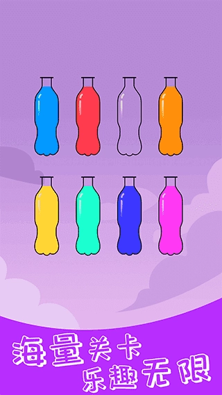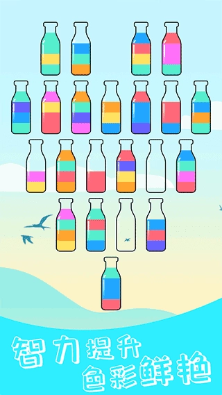 开心拼一拼是一款上手简单却又极具可玩性的益智解压小游戏。玩家需要通过倾倒液体的操作,将原本混合在一起的不同颜色液体,按照颜色归类到对应的瓶子中,最终达成每个瓶子只装有一种纯色液体的目标。游戏关卡循序渐进,刚开始只有两三个瓶子,随着关卡推进,瓶子的数量会逐渐增加,颜色的搭配也会愈发复杂,这对玩家的逻辑推理能力和操作节奏的把控要求也随之提高。游戏中的金币不仅可以用来解锁新的章节,还能让玩家自由更换试管的外观样式和游戏场景的主题,让每一次操作都能带来个性化的视觉体验。