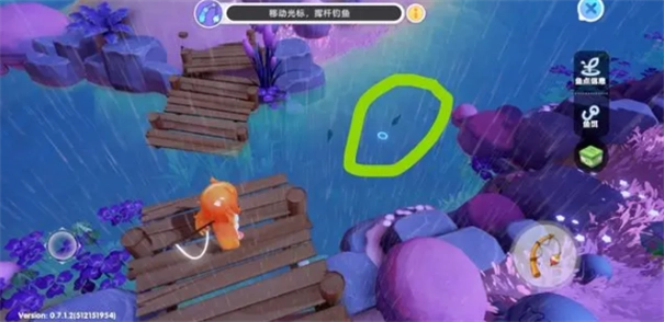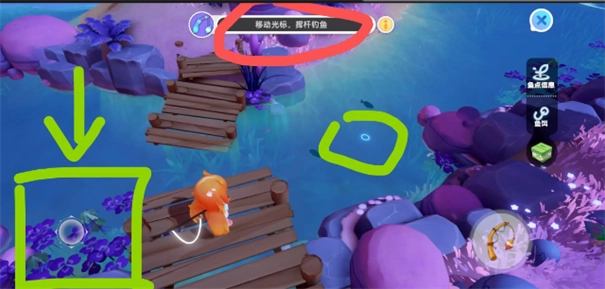 第二步:如图1所示,左侧方向键(绿圈标注位置)用于操控光标(右侧绿圈标注位置)。将光标移动到目标鱼的正前方(如图2),注意要与目标鱼保持一小段距离,避免直接靠近导致鱼被吓跑。即便鱼被吓跑也无需担心,稍作等待后会有其他鱼上钩。