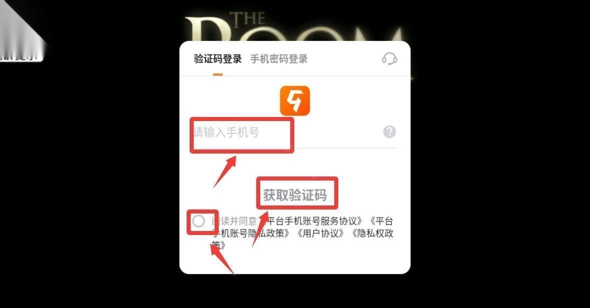 2、先在红色框框里打√并输入手机号码获取验证码。
