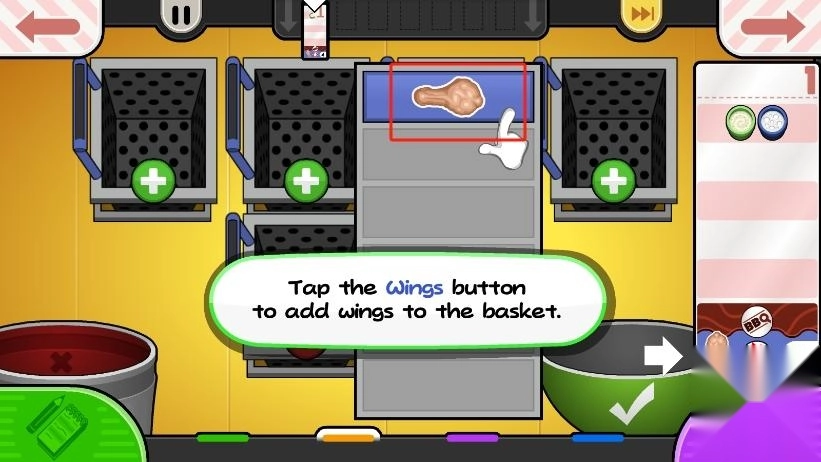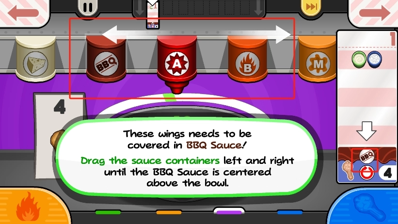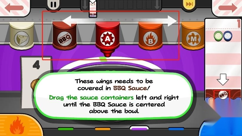 4、接着我们可以看到顾客需要的使BBQ酱料,我们拖动酱料左右滑动放入正确的酱料即可;