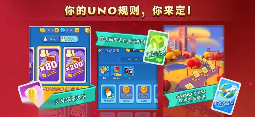 房间模式中可以自定义游戏规则,如加牌叠加、0/7换手牌和强制出牌规则。