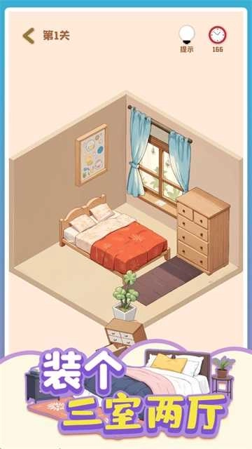 《装个三室两厅》是一款以家装为主题的休闲益智游戏。在游戏里,你能自由挑选沙发、茶几、电视柜等各类家具,把它们巧妙布置在客厅的不同位置,打造出美观又实用的聚会空间。每个房间的家居风格与色彩搭配都由你做主,完成后会收获满满的成就感!