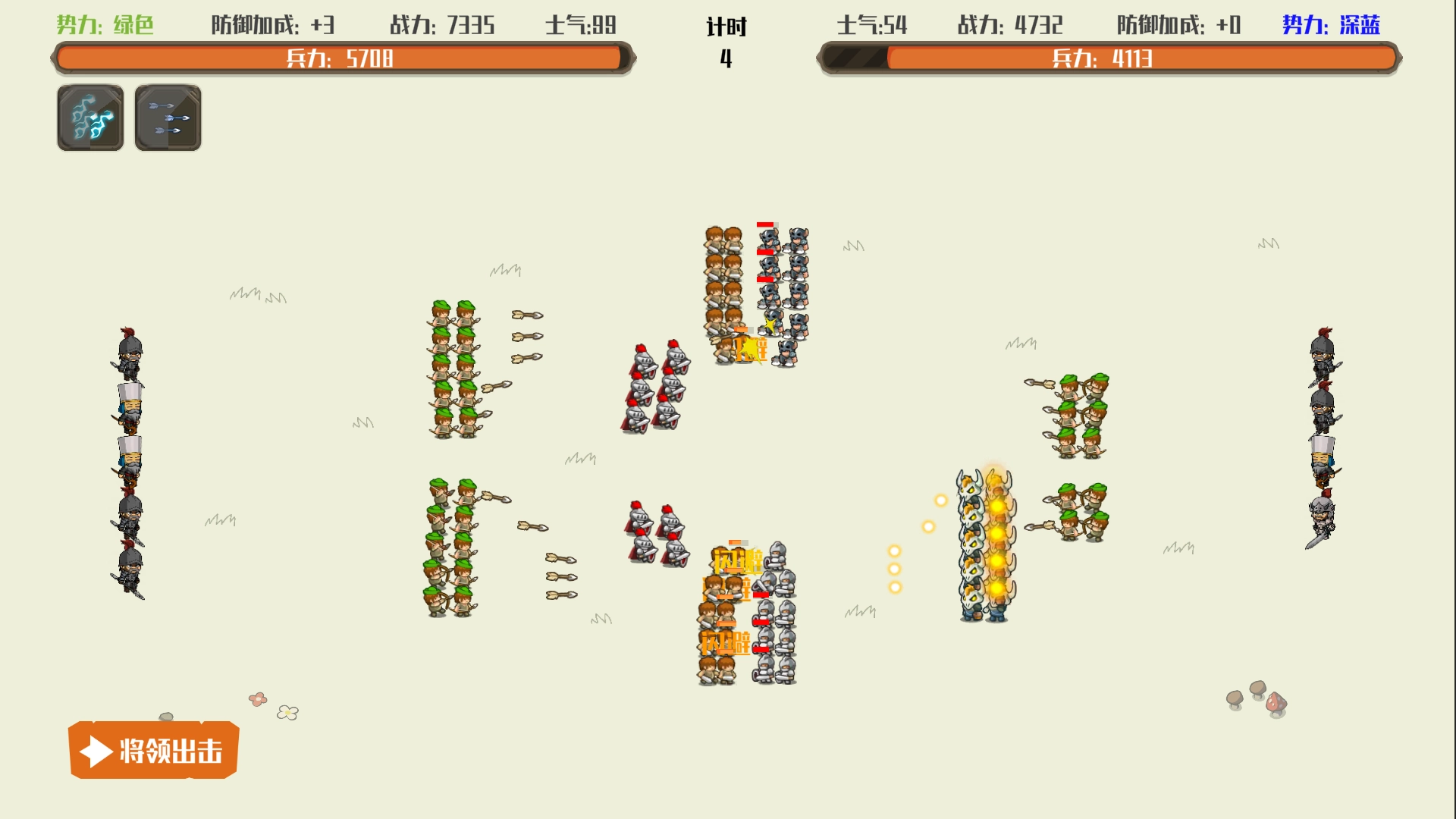 在全军出击的阶段,拥有武将技的将领,只要技能冷却完毕,就能点击释放技能,这会对战场局势造成关键影响。